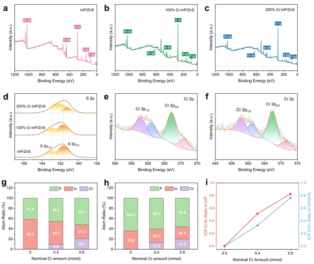 图2 Cr:InP/ZnS量子点的元素与化学状态表征:(a) InP/ZnS量子点、(b) 100% Cr:InP/ZnS量子点、(c) 200% Cr:InP/ZnS量子点的XPS谱;(d) S 2p高分辨XPS谱;(e) 100% Cr:InP/ZnS量子点、(f) 200% Cr:InP/ZnS量子点的Cr 2p高分辨XPS谱;(g) 不同Cr掺杂量的InP量子点、(h) InP/ZnS量子点的电感耦合等离子体(ICP)测试原子比;(i) 基于ICP数据的InP量子点和InP/ZnS量子点中In/P原子比。