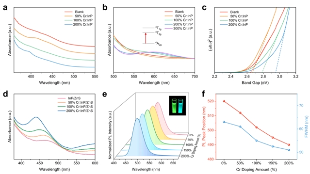 图4 Cr:InP量子点与Cr:InP/ZnS量子点的光学性能表征:(a) 不同Cr掺杂量的InP量子点的吸收光谱;(b) Cr3+离子的4A2g→4T2g跃迁形成的d-d吸收特征;(c) 不同Cr掺杂量的InP量子点的Tauc图;(d) 不同Cr掺杂量的InP/ZnS量子点的吸收光谱、(e) 归一化光致发光(PL)光谱(插图为紫外光(λ = 365 nm)照射下,未掺杂和200% Cr:InP/ZnS量子点在正己烷中的照片)、(f) 不同Cr掺杂量的InP/ZnS量子点的PL峰位与半高宽。