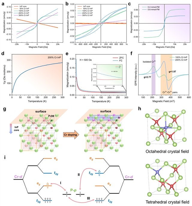 图5 Cr:InP量子点的磁学性能与机制表征:(a) 一系列Cr:InP量子点在−20k Oe ~ +20k Oe磁场范围内的磁滞回线(M−H曲线);(b) −1k Oe ~ +1k Oe磁场范围内的M−H曲线;(c) 100% Cr:InP量子点和200% Cr:InP量子点M−H曲线的铁磁部分;(d) 200% Cr:InP量子点的磁化率倒数与温度的关系;(e) 200% Cr:InP量子点在2–300 K温度范围内的零场冷却(ZFC)和场冷却(FC)曲线(红线为ZFC曲线,蓝线为FC曲线,施加磁场500 Oe,插图为150–300 K温度区间的ZFC/FC曲线照片);(f) 100% Cr:InP量子点和200% Cr:InP量子点在室温下的电子顺磁共振(EPR)光谱;(g) Cr掺杂InP量子点的机制示意图(紫色球为Cr3+离子,红色球为In3+离子,绿色球为P3−离子,Cr3+占据八面体间隙位,In3+和P3−占据四面体间隙位);(h) Cr在八面体晶体场与四面体晶体场中的示意图;(i) 铁磁超交换机制示意图。