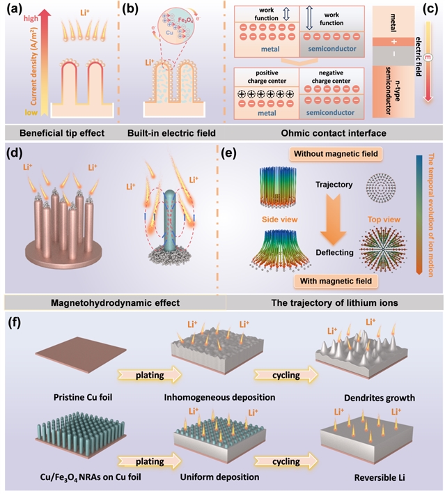 (1)本研究的设计原理在于利用致密有序的纳米尖端阵列,将原本有害的局部尖端效应转化为有利的均匀化电场。传统“有害尖端效应”源于孤立、随机分布的突起,其极小曲率半径导致局部电场急剧增强,引发锂离子过度聚集并诱发枝晶生长。而本工作中垂直排列的阵列内相邻尖端电场相互耦合与屏蔽,在宏观层面平滑了电势分布,显著削弱了局部场强集中;同时紧密排列的尖端增强了锂离子的横向传质,有效缓解了浓度极化并延迟了空间电荷区形成。当Cu与Fe3O4形成异质结时,费米能级差异在界面处建立了由Cu指向Fe3O4的内建电场,该电场通过促进电荷与离子再分布,均匀化界面电荷密度并降低浓差极化。此外,异质结形成的欧姆接触显著降低了界面电阻,提升了电荷转移效率。在沉积过程中,内建电场提供的纵向驱动力与Fe3O4内部磁场产生的洛伦兹力协同作用,使锂离子轨迹发生偏转并呈现螺旋运动,引导离子避开表面突起、沉积于平整区域,从而实现了三维电极表面及间隙中锂离子的均匀分布与沉积,最终形成宏观无枝晶的均匀锂沉积形貌。