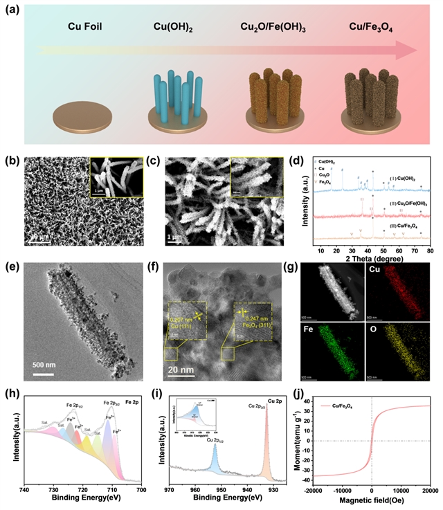 图2. (a) Cu/Fe3O4合成过程示意图。(b) Cu2O/Fe(OH)3的扫描电子显微镜图像。(c) Cu/Fe3O4的扫描电子显微镜图像。(d) Cu(OH)2、Cu2O与Cu/Fe3O4的X射线衍射图谱。(e) Cu/Fe3O4的透射电子显微镜图像。(f) Cu/Fe3O4的高分辨透射电子显微镜图像。(g) Cu/Fe3O4的透射电子显微镜元素分布图。(h) Cu/Fe3O4的Fe 2p与(i) Cu 2p XPS谱图(插图:Cu LMM俄歇谱)。(j) Cu/Fe3O4的磁滞回线。