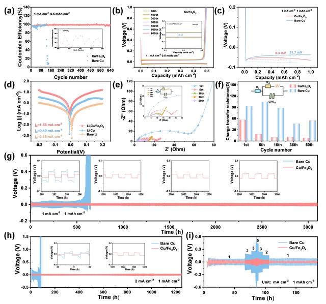 图4. (a) Li||Cu/Fe3O4电池的CE。(b) Li||Cu/Fe3O4电池在不同循环下的电压曲线。(c) Li在Cu/Fe3O4与纯Cu上的成核过电位。(d) Li-Cu/Fe3O4、Li-Cu与纯Li的塔菲尔曲线。(e) Cu/Fe3O4不对称电池的Nyquist图。(f) Cu/Fe3O4与纯Cu电极的电化学阻抗对比。Li-Cu和Li-Cu/Fe3O4对称电池在(g) 1 mA cm−2、(h)2 mA cm−2,1 mAh cm−2容量下的电压滞后曲线。(i) 在不同电流密度下的倍率性能。
