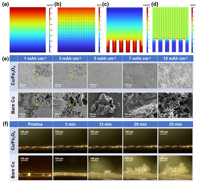 图5. (a) Cu和(b) Cu/Fe3O4中Li+通量分布的COMSOL模拟。(c) Cu和(d) Cu/Fe3O4中电流密度的COMSOL模拟。(e) Cu/Fe3O4与Cu电极在不同锂沉积容量下的表面形貌演变。(f) Cu/Fe3O4与Cu电极在原位光学显微镜的锂沉积行为。