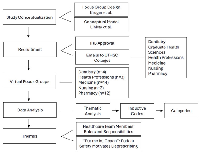 这是一项采用定性研究方法、通过焦点小组访谈收集数据的探索性研究。研究遵循Krueger于2002年提出的焦点小组设计指南,并以Linsky等人2019年构建的减药概念模型为理论框架,该模型涵盖患者、处方者和系统因素三个维度,为临床医生启动和停止药物治疗提供支持。研究团队于2022年在田纳西大学健康科学中心招募了来自医学、药学、护理、口腔医学和健康专业学院的36名学生,组成4个焦点小组,每组6-11人,访谈时长90-120分钟。数据收集持续至信息饱和,经第三方转录后,由3名编码员采用Braun和Clarke的六步主题分析法进行归纳总结、演绎分析和主题提炼。