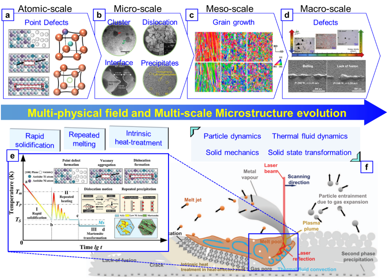 图1 增材制造镍钛基形状记忆合金的微观结构特征:(a) 原子尺度的点缺陷;(b) 微米尺度的微观结构特征,包括团簇、位错、晶界和析出相。(c) 宏观尺度的晶粒分布和形貌特征。(d) 宏观尺度的缺陷,例如孔隙和球化。(e) 热循环作用下镍钛合金的多层次微观结构特征和演变机制。(f) 激光增材制造过程中熔池动态演化机制示意图。