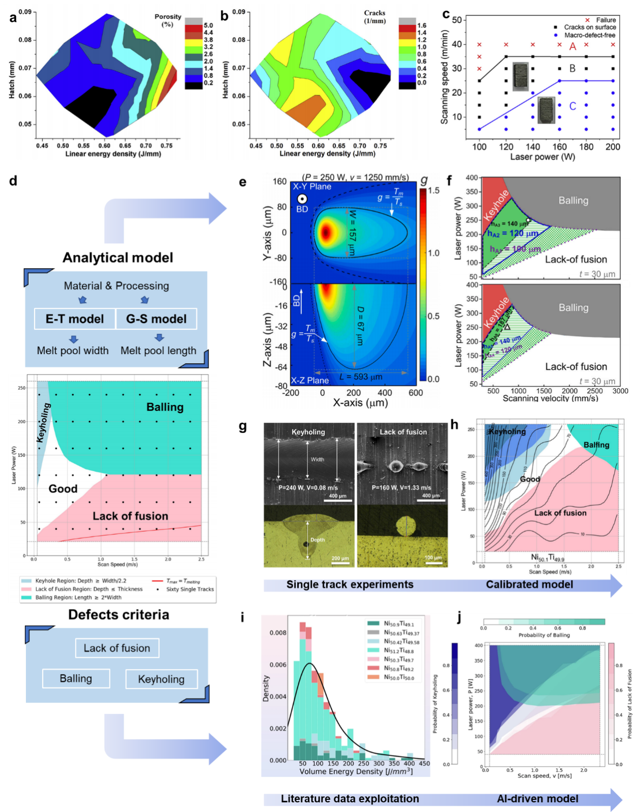 图2 NiTi合金增材制造工艺优化演变过程:从正交实验到经验模型优化再到数据驱动的分类。(a–c)通过正交实验优化工艺参数。(d)冶金分析模型将工艺参数转化为熔池几何特征,并生成缺陷形成判据。(e–f)使用分析模型预测熔池几何特征,并构建NiTi合金的工艺图。(g–h)基于单道实验数据对缺陷预测模型进行校准和验证。(i–j)基于实验数据和AI算法构建通用可打印性概率图。