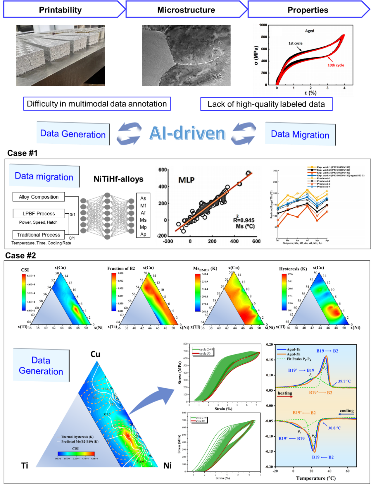 图4 基于人工智能的增材制造镍钛基形状记忆合金设计策略。案例1:基于数据融合和迁移学习的增材制造高温镍钛铪合金设计。案例2:通过集成热力学计算数据和实验性能数据的混合分层筛选方法,设计用于激光粉末床熔融工艺的窄滞后镍钛铜合金。