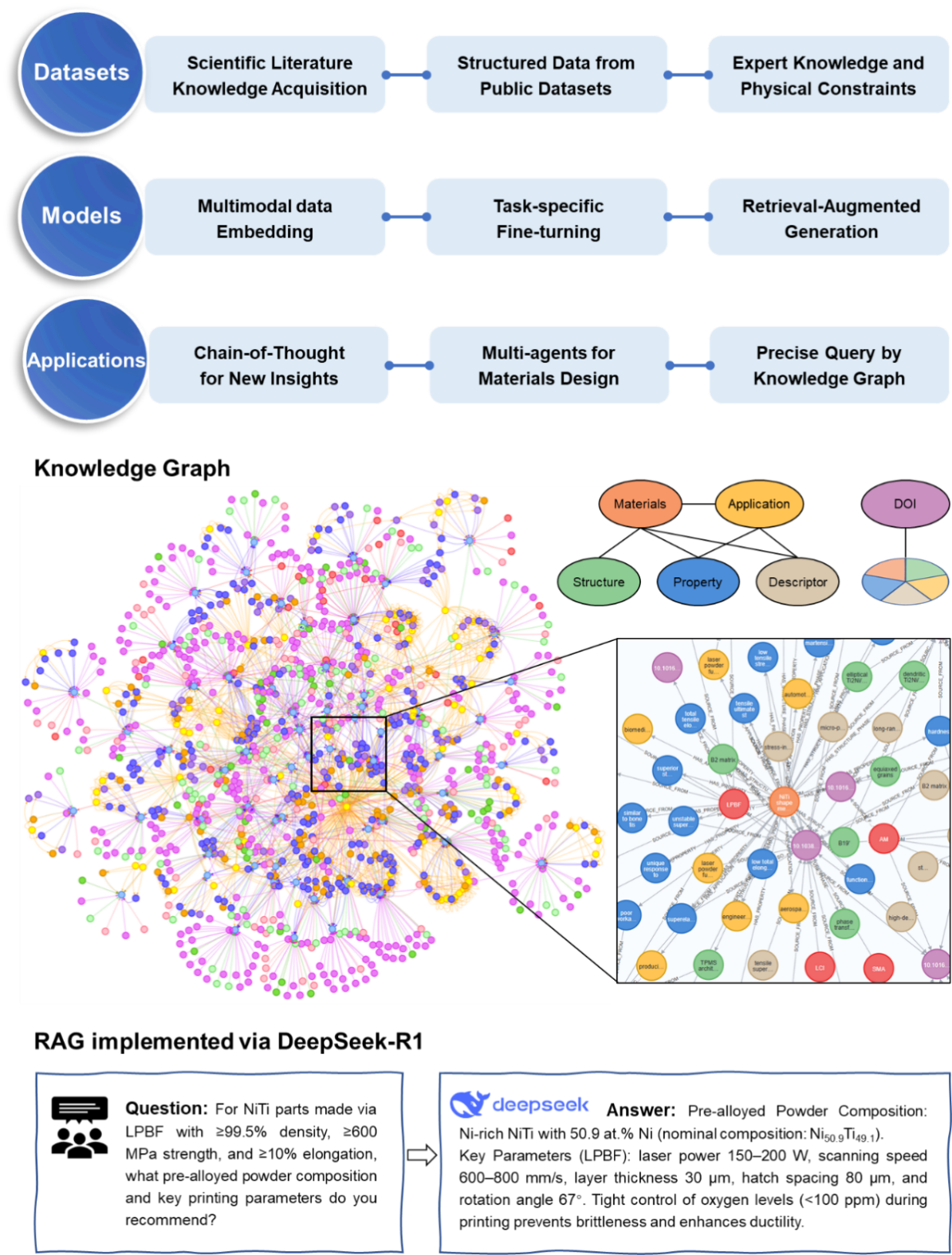 图5 大型模型在增材制造镍钛合金领域的潜在应用。包括应用现状和应用需求、知识图谱构建和演示,以及知识图谱RAG流程的实现和比较。