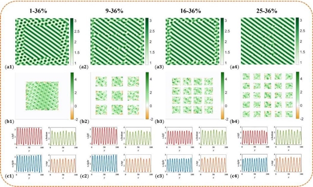 图 2相同控制比例不同控制区域数量下的点状植被斑图向条纹斑图恢复对比图。(a1)-(a4) 植被斑图;(b1)-(b4) 区域内部人类活动强度分布;(c1)-(c4) 区域边界人类活动强度分布;