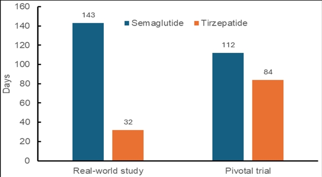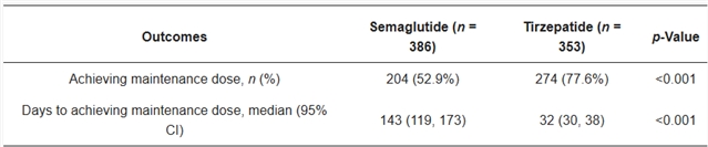 达到维持剂量的中位时间为:司美格鲁肽:143 天,替尔泊肽:32 天,差异同样显著(p < 0.001)