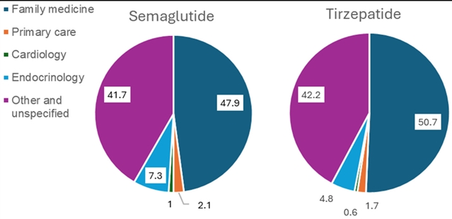图 2:司美格鲁肽与替尔泊肽在不同专科中的处方分布情况.