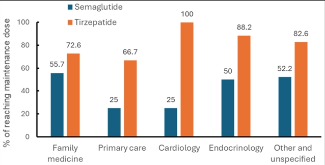 图 3: 不同专科处方下司美格鲁肽与替尔泊肽维持剂量达标率