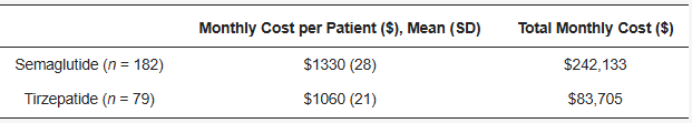 未达维持剂量期间的月度保险支付成本约为:司美格鲁肽:24万美元;替尔泊肽:8万美元。虽然未能评估个体疗效,但长期停留在非推荐剂量状态,可能影响资源利用效率。