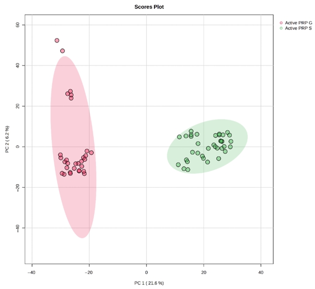PCA评分图显示PRP-G和PRP-S样本有明显的聚类