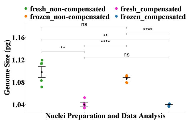 图: 比较使用不同细胞核分离和数据分析方法获得的4个物种的平均 1C 值。统计分析采用 Fisher 方差分析,并使用 Benjamini-Hochberg 错误发现率 (FDR) 校正进行事后比较。显著性水平标注如下:ns = 无显著性 (p > 0.05),* = p < 0.05,** = p < 0.01,*** = p < 0.001,**** = p < 0.0001。