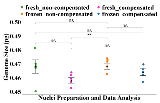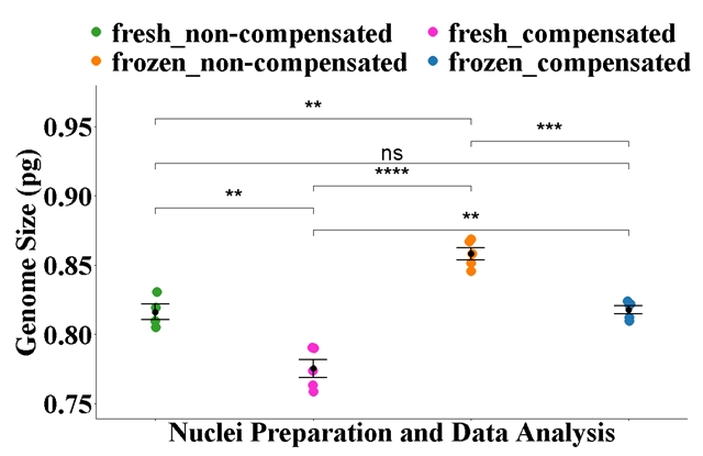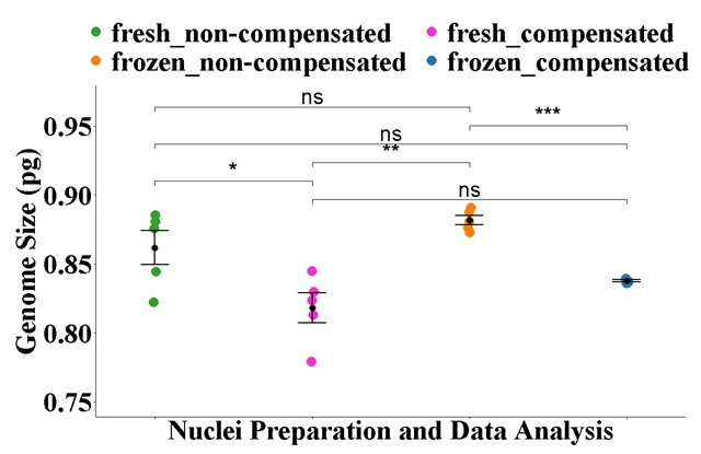 所有物种的细胞核制备方法与基因组大小数据分析方法之间的双向交互作用不显著。单因素方差分析进一步证实了不同细胞核制备和数据分析方法组合的显著性。冷冻材料的基因组大小估算结果与新鲜材料的结果相似,误差范围有所缩小,但差异并非总是显著。在某些物种中,冷冻样品可以获得比新鲜材料多得多的细胞核。通过添加特定的碎片补偿算法,变异系数 (CV%) 可以保持在 5% 以下。该方法对于评估从偏远地区采集并冷冻保存用于植物基因组测序的样本的基因组大小具有特殊价值。冷冻可以保存高质量的 DNA 和 RNA,从而使同一份样本能够同时用于流式细胞术和基因组测序。