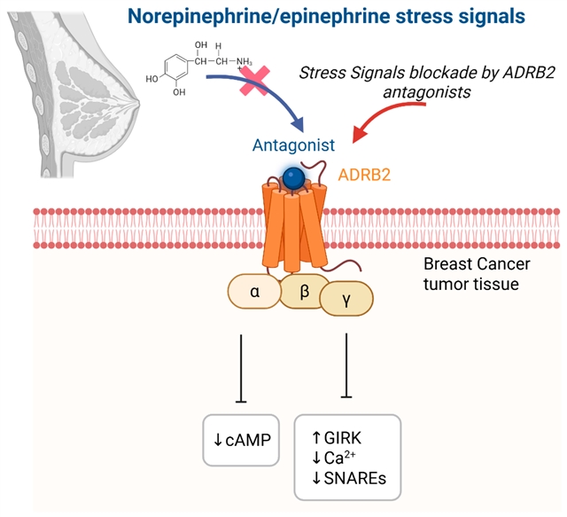左图:非典型β受体阻滞剂的抗肿瘤活性。红色十字表示β受体阻滞剂对儿茶酚胺应激信号的阻断作用。