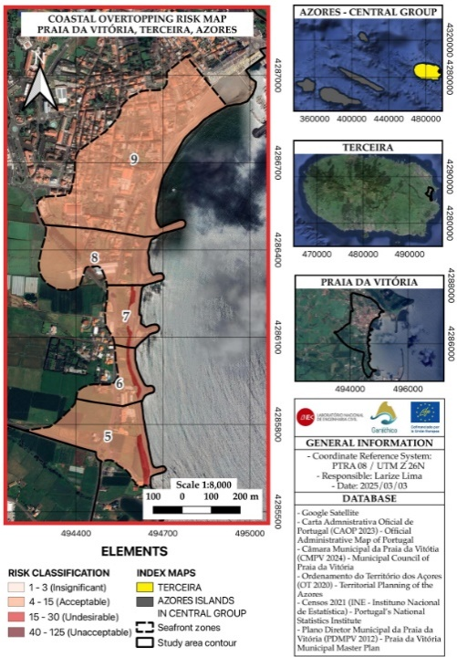 本研究基于LIFE-GARACHICO项目(2021–2026),在普拉亚达维多利亚开展了一项综合风险评估。研究首先结合海洋学数据和模型(如SWAN和DREAMS)计算了海岸越浪事件的概率,同时通过地理信息系统(GIS)和多标准分析(AHP层次分析法)评估了社会脆弱性(包括人口、土地利用、建筑、文化遗产和海拔等因素)。风险水平通过概率与脆弱性的乘积确定,分为可忽略、可接受、不理想和不可接受四个等级。结果显示,该地区风险总体可接受,局部区域(如 Zones 5–7)因越浪频率较高而呈现不理想风险,主要归因于中等脆弱性(平均指数0.43)和较低概率(多数区域发生概率低于10%)的组合。