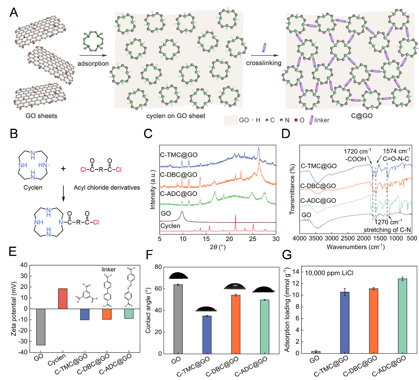 Cyclen中丰富的-NH-基团使其具有较高的pKa值和正电性。带负电荷的氧化石墨烯(GO)具有丰富的-OH和-COOH基团,是构建阳离子吸附剂的理想载体。通过酰氯化反应,将具有优异锂亲和性的Cyclen与经典光敏分子偶氮苯共价偶联,并负载于GO表面,成功构筑了一种新型共价网络材料(C−ADC@GO)。该材料巧妙地利用偶氮苯在不同光照下的反式和顺式可逆构型转换作为“光控开关”,以动态调节Cyclen笼型空腔的尺寸。通过XRD、FTIR、Zeta电位、接触角等表征手段验证了使用不同酰氯衍生物制备的系列Cyclen-linker@GO的成功合成。