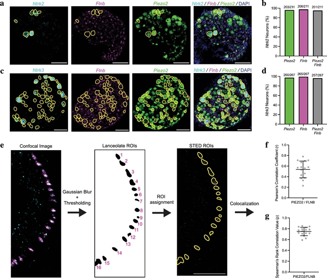 Abstract: PIEZOs are mechanically gated ion channels that transduce force into electrochemical signals1. PIEZO1 responds to diverse stimuli including membrane stretch2 and shear stress3, whereas PIEZO2 is generally tuned to detect cellular indentation4,5. The functional specialization of PIEZO2 is proposed to underlie its distinct physiological roles, including mediating the sense of touch6,7. How PIEZO2 achieves this selectivity despite its close structural similarity to PIEZO1 is unclear. Here we combine single-molecule MINFLUX fluorescence nanoscopy with electrophysiology to link the conformational states of PIEZO2 to channel gating in intact cells. We find that PIEZO2 is intrinsically more rigid than PIEZO1, and that disparate mechanical stimuli paradoxically evoke opposite conformational and gating responses in each channel. These unique gating properties arise in part from a connection to the actin cytoskeleton, and we identify filamin-B (FLNB) as a molecular tether that is required for this interaction. This complex alters how force is transmitted to PIEZO2 and confers heightened sensitivity to and selectivity for cellular indentation. PIEZO2 and FLNB are co-expressed in somatosensory neurons and colocalize within tens of nanometres at the end organs of cutaneous mechanosensory afferents. These findings help to explain why PIEZO2 is a specialized mechanosensor and provide a molecular blueprint for understanding how cells decode diverse mechanical stimuli across tissues and organ systems.