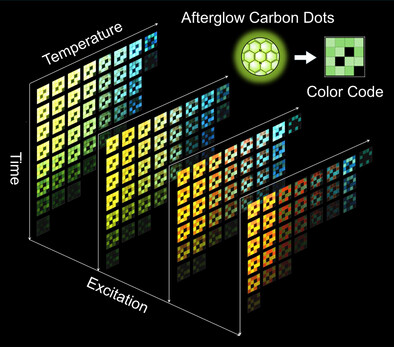 Abstract: Dynamic afterglow carbon dots (CDs) materials, capable of long-duration emission and dynamic color changes after excitation, hold promise for widespread applications in high-level encryption and visual sensing. However, the single-variable response afterglow color changing limits the potential of CDs for multidimensional information encoding and dynamic encryption in complex environments. Here, we report metal-free CDs with triple-variable responses (time, temperature, and excitation wavelength) for multiple dynamic afterglow colors and an ultra-high afterglow brightness (406 cd m2) far exceeding those of other afterglow materials. Based on the synergistic effect of triple matrix confinement and interface effects, roomtemperature phosphorescence (RTP) and thermally activated delayed fluorescence (TADF) are integrated into a single CD system. Owing to the different lifetimes of the dual-mode afterglow (phosphorescence and TADF) and their varying sensitivities to temperature and excitation wavelength, time-dependent afterglow colors (TDAC), excitation-dependent afterglow colors (EDAC), and thermochromic afterglow (TCAG) are simultaneously achieved. Finally, we also designed a three-dimensional variable-response color code that varies with time, temperature, and excitation wavelength, spanning the entire visible spectrum. This platform enables high-capacity, programmable, full-gamut, and visually intuitive information encryption and display, providing a promising pathway for advanced, multidimensional anti-counterfeiting and secure communication technologies.