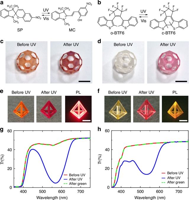 图1系统展示了两种3D打印光致变色材料的分子结构、宏观变色效果及光谱特性。图1a和b分别为螺吡喃(SP)与二芳基乙烯衍生物(BTF6)的分子结构,其中SP在紫外光(UV)照射下从无色开环结构(SP)异构为紫色部花青(MC),而BTF6则从无色开环(o-BTF6)转化为红色闭环(c-BTF6)。图1c和d通过实物照片对比了含SP和BTF6的3D打印样品(如长方体)在UV照射前后的颜色变化,未照射时均为无色透明,照射后分别呈现深紫和红色。图1e和f进一步展示了金字塔形打印结构的变色与荧光特性:UV照射后,SP/MC体系发出654 nm红色荧光,BTF6体系发出617 nm橙色荧光,验证了分子在3D打印后仍保持光致变色与荧光活性。图1g和h的透射光谱显示,UV照射后SP/MC在565 nm处出现新吸收峰,BTF6在535 nm处出现吸收峰,且绿光照射可完全恢复初始光谱,证明两种材料均具有可逆光响应特性。