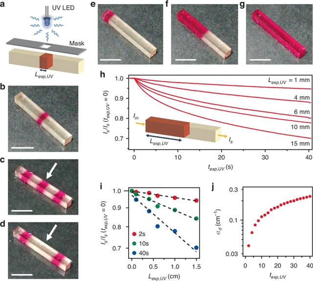 图3验证了材料在空间和时间维度上精确控制光信号的能力。实验通过阴影掩模选择性曝光BTF6打印样品(图3a),实现了复杂图案的“写入”与“擦除”:图3b-g显示,UV照射可在样品表面生成特定颜色区域(如条纹、斑点),而绿光可选择性消除这些区域,空间分辨率达毫米级。图3h-j定量分析了光传播调控效果:通过改变UV曝光时间(2-40秒)和曝光区域长度(1-15 mm),动态衰减系数(αd)可调控范围达1个数量级,且符合指数衰减规律。这一结果表明,通过组合UV和绿光曝光,可实现对光信号强度的多维精准调控,为构建光处理器提供了核心性能支撑。