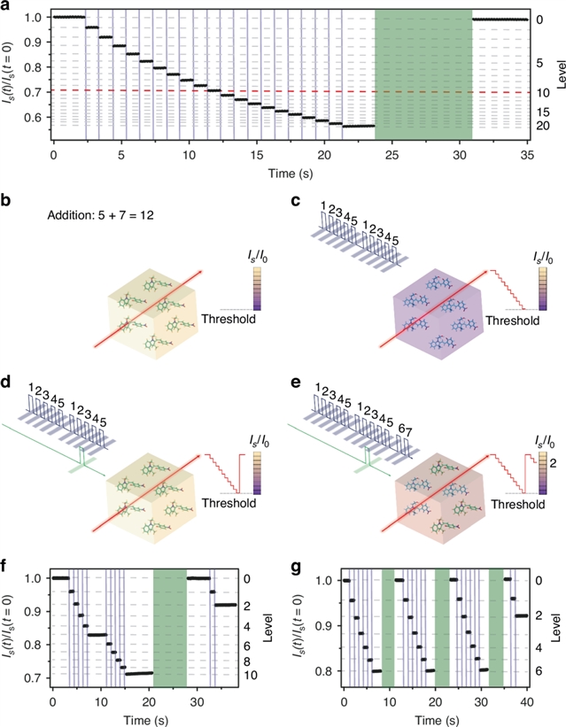 图4展示了材料在全光计算中的应用,首次实现了基于3D打印光致变色体系的算术运算。图4a记录了SP/MC器件在20次UV脉冲照射下的透射强度变化:每次UV脉冲使材料逐步转化为MC态,透射光强度阶梯式下降,绿光照射可完全复位初始状态。基于此特性,研究实现了加法(5+7=12)和除法(20÷6)运算:以加法为例(图4b-e),通过UV脉冲数量对应加数(5+7=12次脉冲),当透射强度降至阈值(Ith/I0=0.71)时发送绿光复位脉冲,复位次数(1次)代表十位,最终强度(0.92)代表个位,实验结果与理论计算完全一致(图4f)。除法运算则通过设置阈值为除数(6),复位次数为商(3),剩余强度为余数(2),验证了材料的逻辑计算能力。
