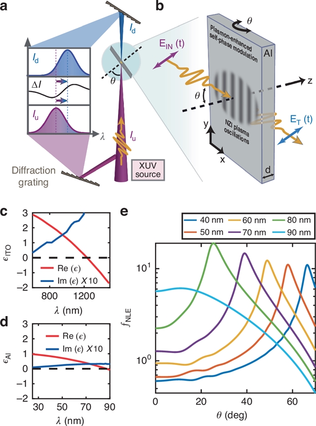研究团队首次在实验上实现了极端紫外波段基于近零介电常数的非线性增强,创新性地利用厚度为300nm的铝自由支撑箔激发可广泛调谐的Ferrell-Berreman模式(如图1b示意图)。通过FERMI自由电子激光装置的极端紫外脉冲激发,结合角度依赖的光谱调制测量与理论分析,在低至380 GW/cm2的峰值强度下观察到高效的自相位调制增强,突破了传统极端紫外波段非线性效应微弱的局限,为极端非线性光学研究提供了新的实验范式。