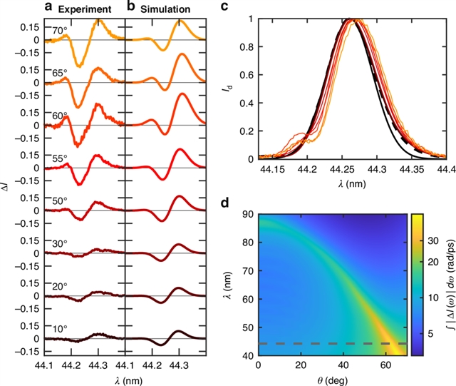 研究团队采用厚度为300nm的铝自由支撑箔作为实验材料,采用FERMI自由电子激光装置的极紫外脉冲进行激发,通过调节入射角度来控制 Ferrell-Berreman模式的激发。实验中观察到在载波波长约44nm处,自相位调制增强与入射角密切相关,且理论模型通过考虑超快加热和饱和效应,很好地复现了实验中光谱调制的角度和功率依赖性,揭示了该非线性增强效应的物理机制。