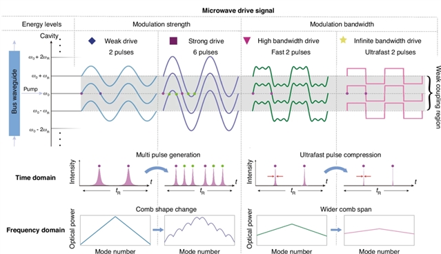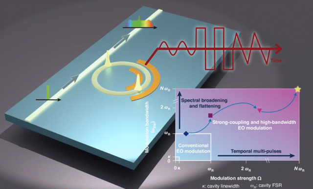 基于电光效应(泡克尔斯效应)的电光脉冲与频率梳是相干通信、微波光子学、精密计量、光子互连与量子信息等应用的核心。其中,基于光学微腔的电光频率梳通过在微腔中引入相位调制来产生光频梳:当泵浦光在微腔中穿过微波驱动的相位调制器时,微波引起的电光耦合会生成新的频率分量(被称为边带)。光学微腔放大了这一效应,从而能够提供生成超大频谱展宽的光频梳,因而备受关注。另一方面,微波驱动的相位调制等效的在不同频率模式之间形成了电光耦合,为合成维度研究拓扑、非厄米物理等系统打下了坚实基础。