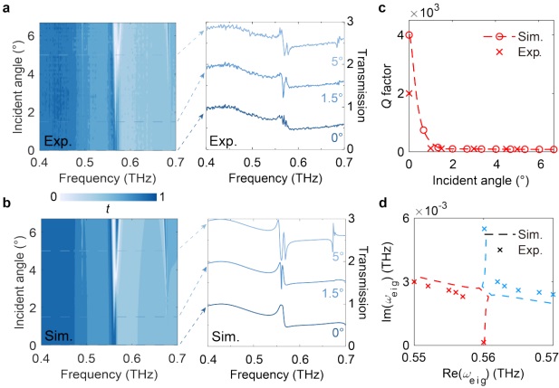 全介质太赫兹超表面主体是一个高阻硅(损耗极低)薄板,上面周期性地排列着空气孔。结构简单,易于加工,且能在太赫兹波段支持高Q值的准BIC模式,通过精确改变入射角,驱动系统从BIC状态演化至EP状态。实验测量结果与理论预测高度吻合(图1,图2)。
