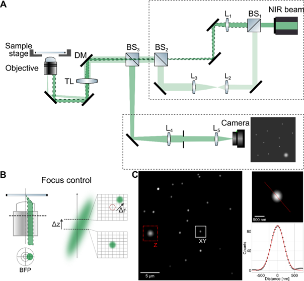 图1:(A) 稳定系统的光路示意图。分束器(BS1)将近红外光分成两路。在轴向(Z)对焦光路(虚线边框所示光束)中,透镜(L1)与显微镜的管镜(TL)构成一个4f系统。对于平面方向(XY)稳定,由L2和L3组成的扩束望远镜将光束扩展,并经由TL聚焦于物镜的后焦面(BFP),两条激发光路通过BS2合束,BS3用于分离激发光和相机探测信号。在探测光路中,物镜与TL组成的系统在BS3与L4之间形成一个中间像。由TL和L4构成的4f系统在后焦面像面处设置了一个光阑,以阻挡准直后以大角度入射、并因L4离轴聚焦的反射激发光。光阑之后,另一中继透镜L5将金纳米颗粒的像成在相机上。(B) 基于全内反射的焦点稳定方法示意图。焦点位移Δz 转化为图像中焦点信号的横向位移Δr。(C) 金纳米颗粒散射信号与焦点反射信号图像(红框标示)。单个金纳米颗粒(白框标示)的细节及其一维强度分布(点)的高斯拟合曲线(红线),拟合标准差σ= 184 nm。