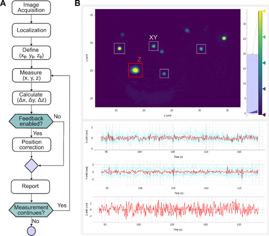 图2:稳定系统软件。(A)稳定软件的主要处理流程框图。(B)图形用户界面的主窗口截图。上方面板显示焦点光束(红色方框)与选定的基准标记感兴趣区域(白色方框)的实时图像;下方面板显示各方向(XY位移用青色线条,Z位移用红色线条)及平均位移(红色线条)随时间变化的曲线图。