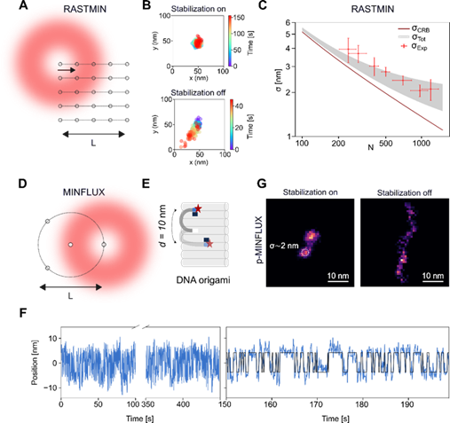 图3:利用稳定系统在RASTMIN中实现的定位精度及p-MINFLUX对动态DNA折纸结构的成像。(A)RASTMIN的激发光束模式示意图。(B)RASTMIN在开启与未开启主动稳定状态下对单分子定位性能的比较。样品为带有固定单个ATTO 647N荧光团的DNA折纸结构,测量时间为150秒(每个时间仓长度为216毫秒,平均光子数=1000)。未开启稳定系统时,因样品漂移导致荧光团移出激发光束模式,有效采集时间仅约40秒。(C)对单个ATTO 647N分子进行不同光子数N的RASTMIN测量所得的定位精度。每个N值下进行了四次独立测量,各获得100次定位结果。图中同时给出用于比较的理论精度下限(实线)及考虑稳定系统贡献的预期总精度(灰色阴影区域)。(D)p-MINFLUX的激发光束模式示意图。(E)动态DNA折纸“钟形”结构示意图,该结构包含单个ATTO 643荧光团及两个间距10 nm的结合位点。(F)使用p-MINFLUX沿DNA折纸主轴获得的450秒定位轨迹(每个时间仓长度=100毫秒)及其50秒细节放大图。(G)p-MINFLUX在开启与未开启主动稳定状态下的性能比较。样品:动态DNA折纸“钟形”结构,其中单个ATTO 643荧光团在两个相距10 nm的位置间切换。测量时间:112秒(时间分箱70毫秒,平均光子数=1800)。