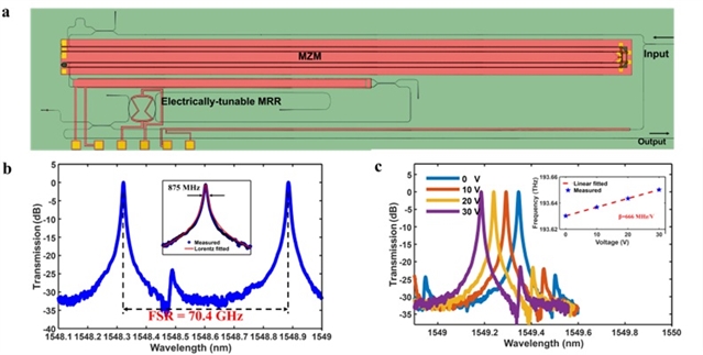 图2:TFLN光芯片微环滤波器性能表征。(a)芯片显微镜照片;(b)微环谐振器的归一化传输谱;(c)谐振波长随直流电压的线性调谐特性