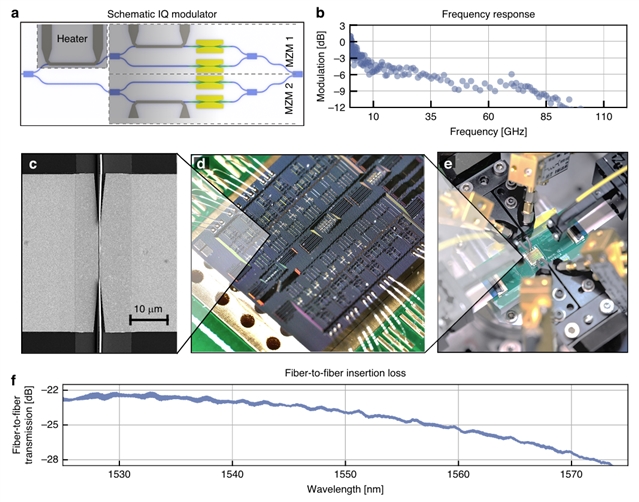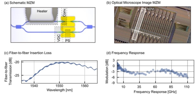 C波段MZM调制器采用SiN多模干涉仪实现光信号的分束与合束,两臂集成等离子体移相器及光子-等离子体转换器(图2a、b)。测试结果显示,调制器在1550 nm 处光纤插入损耗为 -20.3 dB(图2c);频率响应在 10-110 GHz 范围内仅 3 dB 衰减(图2d)。表征证实,MZM 调制器可实现 256 GBd 的最高符号速率,为平台高速光通信应用奠定性能基础。