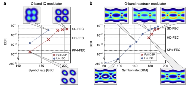 研究人员对另两种调制器进行数据传输实验(图6):相干测试C波段IQ调制器(图6a),正交幅度调制(4 QAM)格式下实现 224 GBd符号速率,(对应448 Gbit/s 线速率,为SiN平台及BTO基调制器最高记录)。以 IM/DD 架构测试O波段RT调制器(图6b),2 PAM格式下达200 GBd符号速率,片上损耗< 2 dB。相较同类调制技术,两款器件在不同波段、架构下均展现出高速率与DSP兼容性优势,印证平台对多种距离通信场景的全适配能力。
