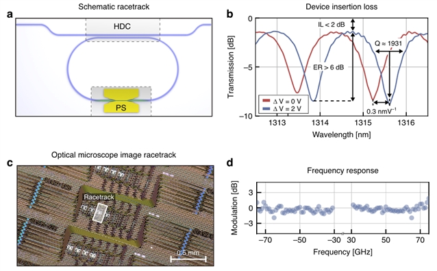 该平台的调控能力可覆盖 1260-1360 nm(O 波段)与 1530-1565 nm(C 波段)双光谱窗口。研究人员设计了三款针对不同应用场景的调制器:C 波段马赫-曾德尔(MZM)调制器、C 波段同相正交(IQ)调制器及 O 波段跑道微环(RT)调制器(图1d-1f),三款器件均采用同一工艺实现单片集成,为后续多波段、高速率调制性能验证奠定了结构基础。