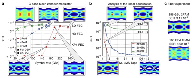研究人员通过多调制格式传输实验(图5)证明:二进制脉冲幅度调制(2 PAM)格式下符号速率达256 GBd,4 PAM达170 GBd,8 PAM 达96 GBd(图5a)。前馈均衡器(FFE)抽头数分析表明,140 GBd仅需10个抽头,160 GBd用21个抽头即可满足KP4-FEC要求(图5b)。400 m光纤传输实验中,2 PAM 256 GBd与4 PAM 160 GBd的误码率均低于纠错前误码率(SD-FEC)阈值,眼图性能仅轻微下降(图5c)。