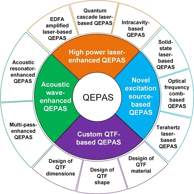 QEPAS技术是基于气体的光声效应,利用石英音叉探测气体吸收激光能量后产生的光声信号,进而获知气体的浓度信息。在QEPAS系统中,检测性能直接受到石英音叉叉指间的声波强度的影响,声信号越强,石英音叉的激发振动位移越大,产生的压电响应越明显,从而能够提高信号水平和气体检测的灵敏度,因此,增强声波和石英音叉之间的相互作用是提高检测性能的关键途径。图2中梳理了当前QEPAS系统探测性能多种改进方案,主要技术路径包括:1)高功率光源激发增强;2)新型光源增强;3)定制石英音叉增强;4)声学共振增强。文中也从这四个主要角度详细总结了关于QEPAS技术的最新研究进展。