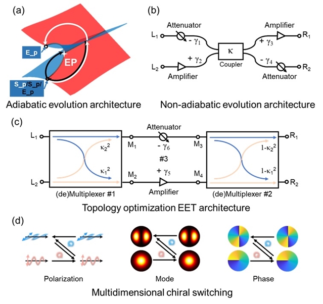非厄米系统凭借其开放性和独特的非厄米特性,展现出许多独特而奇异的物理现象。特别地,在调节两个或多个系统参数时,非厄米哈密顿量的本征值与本征态会形成复数能谱,并在奇异点(EP)处发生本征值和本征态同时简并的特征行为。在光子学中,具有可控增益或损耗的开放体系为研究 EP 及其相关效应提供了理想平台,例如灵敏度增强、单模激光等典型现象等。此外,围绕 EP 的动态环绕过程还会引发光的手性转换,其最终输出态完全由环绕方向决定(图1a)。为了避免动态环绕过程的复杂性,研究者提出了一种基于体光学元件的模拟架构(图1b),可用于实现偏振或路径的手性转换。值得注意的是,光子具有丰富的多物理维度,且研究已从单一维度扩展到多维非厄米系统。然而,如何实现高效的多维手性转换,仍然是当前亟待解决的关键科学问题。