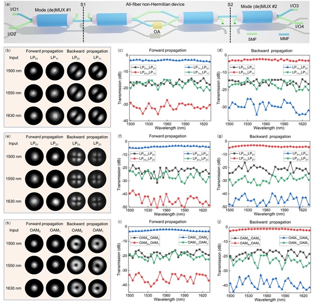 为验证手性模式转换,研究团队利用自制的LP模式(解)复用器和其他光纤器件构建了全光纤的手性模式器件(图2a)。图2b-d展示了该手性模式器件的输出光斑和传输光谱,表明该器件在1500 - 1630 nm的波长范围内右边输出模式锁定为LP01,左边输出模式锁定为LP11。此外,通过更换高阶模式或者OAM模式(解)复用器,该全光纤的手性器件还可以展示LP01\LP21模式和OAM0\OAM1模式手性转换(图2e-j)。