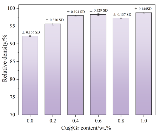 系统研究了Cu@Gr添加量(0、0.2、0.4、0.6、0.8、1.0 wt.%)对W-Mo-Cu复合材料的微观结构和性能的影响。结果发现,未添加Cu@Gr的样品微观结构疏松且存在明显孔隙;而当添加0.6 wt.% Cu@Gr时,W-Mo-Cu复合材料具有均匀致密的微观结构,铜相分布连续,界面结合良好,综合性能最优。具体表现为:较未添加Cu@Gr的样品,W-Mo-Cu复合材料的相对密度提升至98%,提高约8%;热导率和电导率分别提升至181.54W/(m·K)和35.99%IACS,增幅分别为64%和73%;维氏硬度也提高24%,达到256.57HV(图2)。