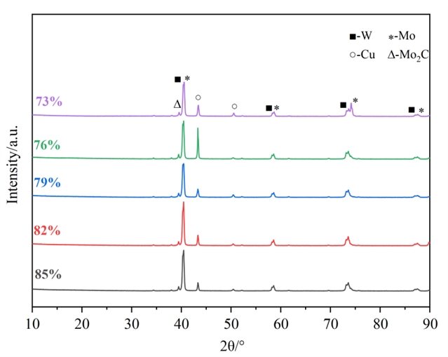 图3. 不同W-Mo生坯骨架密度下制备的W-Mo-Cu复合材料的XRD结果