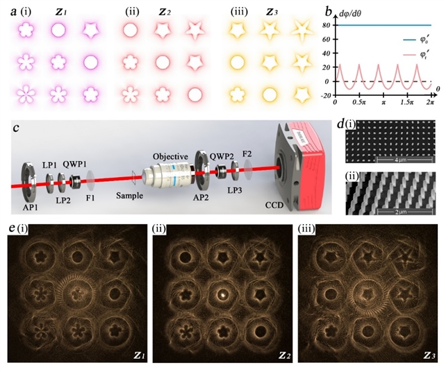 为了探索多维度光学信息的综合调制能力,研究团队基于非晶硅双折射超表面设计和加工手段,通过结合广义涡旋光束阵列与矢量达曼优化的设计手段,构建三维空间广义涡旋光束阵列,并且结合矢量优化和空间多级次衍射分布设计,实现了包含三维空间阵列信息、偏振、相位、轨道角动量、强度轮廓等全参量光学自由度的综合控制。针对标量光场调控,该广义涡旋光束阵列能够通过达曼超表面优化和达曼波带片结合的设计方法,构建三维分布的涡旋光束阵列。利用广义涡旋光束设计方法,能够实现各衍射级次图案信息的关联设计,针对27个空间衍射级次,能够自定义设计图案轮廓特征。实验中,在不同深度的观察条件下,能够整齐清晰地展现各不相同的光束信息。针对矢量光场设计,将矢量优化的设计方法与达曼超表面、达曼波带片结合,各个衍射级次可以实现不同偏振特征的同步优化,由此可以实现自定义光束轮廓特征与偏振状态的联合设计。实验中,通过在不同深度以及不同偏振状态的观察条件,可以观测到多维度光学信息。