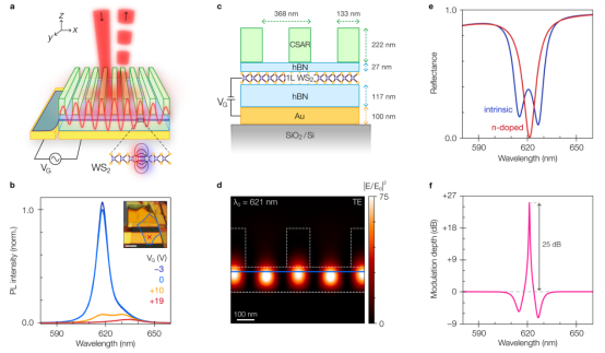 研究人员首先展示了其自由空间光调制器的结构示意图(图1a),器件性能源于单层二维半导体与介电超表面的协同作用。这种混合二维调制器是通过对原子级厚度的二硫化钨中激子共振的电调控,结合导模共振所提供的电磁场增强效应,实现对入射光场的强调制。