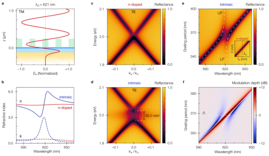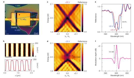 为验证该设计方案,研究人员采用干法转移技术,将机械剥离的WS?和hBN薄片组装在预图案化的金电极上。通过电子束光刻技术,在旋涂的化学半增强抗蚀剂(CSAR)层中制备亚波长光栅,从而实现异质结构腔的功能化(图 3a),并通过原子力显微镜验证了结构的均匀性(图3b)。后续对实验中的背焦面成像光谱角分辨色散、偏振反射光谱以及调制深度进行了测量和分析。