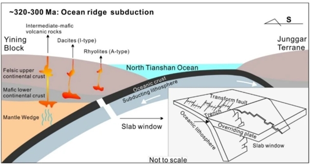 它们起源于经流体交代的亏损地幔楔。然而,由于俯冲相关流体的输入量和部分熔融程度存在差异,中基性火山岩在微量元素组成上表现出细微差别。I型英安岩富集Ba、K、U、Pb,亏损Nb、Ta、Ti,是由基性下地壳部分熔融形成。A型流纹岩以富集Rb、Th,亏损Ba、Sr、P为特征,与长英质上地壳部分熔融的成因一致。区域岩浆作用和成矿作用的时空分布模式表明,晚石炭世北天山造山带处于洋脊俯冲背景之下。