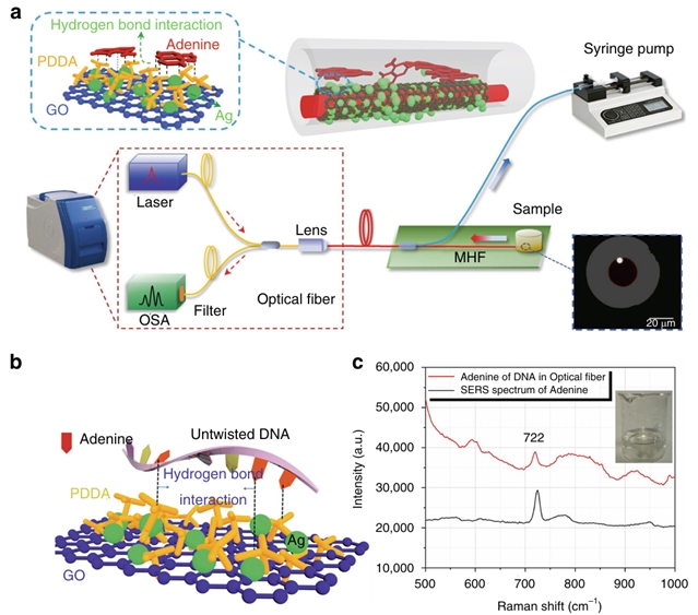 图2:基于微结构悬浮芯光纤(M-SCF)的腺嘌呤表面增强拉曼散射(SERS)检测装置:a.光纤内微流控SERS检测装置示意图;b. DNA与GO/PDDA/Ag SERS基底的反应示意图;c.微流控光纤内DNA中腺嘌呤的拉曼位移光谱
